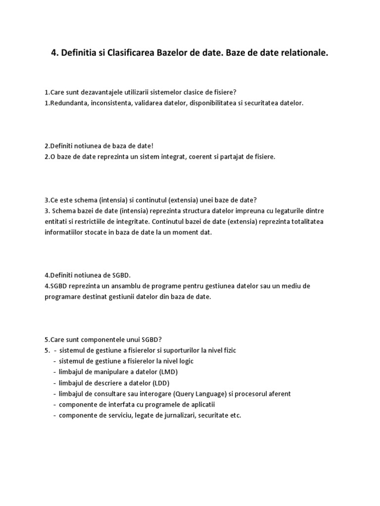 O bază de date, uneori numită și bancă de date (abreviat bd), reprezintă o modalitate de stocare a unor informații și date pe un suport extern (un dispozitiv de stocare), cu posibilitatea extinderii ușoare și a regăsirii rapide a acestora. Ca şi utilitate, bazele de date ne permit (1) memorarea unor cantităţi mari de date, (2) regăsirea datelor pe baza unor criterii ce căutare (ce sunt bazele de date relaţionale sunt un tip de baze de date în care datele, văzute ca şi atribute ale entităţilor reale, sunt socate în tabele şi sunt legate între. 1) expresia omul sau calculatorul prelucreaza informatie: